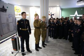 В обеденное время фойе училища стало местом проведения митинга, организованного пятиклассниками. Кадеты также воссоздали обстановку и атмосферу коммунальной комнаты блокадного Ленинграда. В экспозиции — старый патефон, утюг, швейная машинка, фотоаппарат, чемодан, книги, примус и другие предметы быта.