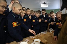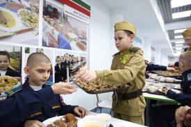 Особым моментом дня стал обед в кадетской столовой. Пятиклассники, совместно с поварами, испекли и предложили попробовать кусочек блокадного хлеба. Этот хлеб, состоящий из ржаной муки, солода, жмыха, отрубей и даже опилок, был испечён кадетами вместе с поварами. Он позволил кадетам не только узнать, но и ощутить на вкус, какой ценой давалась каждая крошка хлеба в осажденном городе. Это не просто хлеб – это вкус стойкости, вкус надежды, вкус Победы.