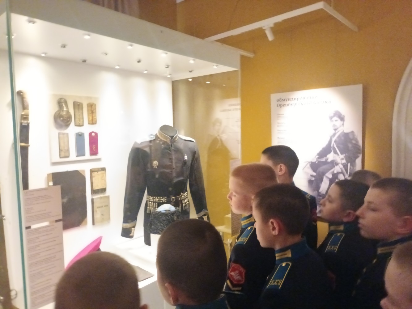 Мальчишки с интересом слушали рассказ экскурсовода, с большим интересом рассматривали подлинные экспонаты, на выставке их более 200 !!! Особое внимание кадет привлекли оружие и обмундирование, награды и знамена, орудия рыболовства, а также пушка из войска Емельяна Пугачева, жалованные сабли, иконы. Экскурсовод умело сочетал факты с увлекательными историями: рассказывал не только о датах и событиях, но и о людях, чьи судьбы связаны с нашим Оренбургским краем. Благодаря этому история оживала, а сухие цифры превращались в живые сюжеты.